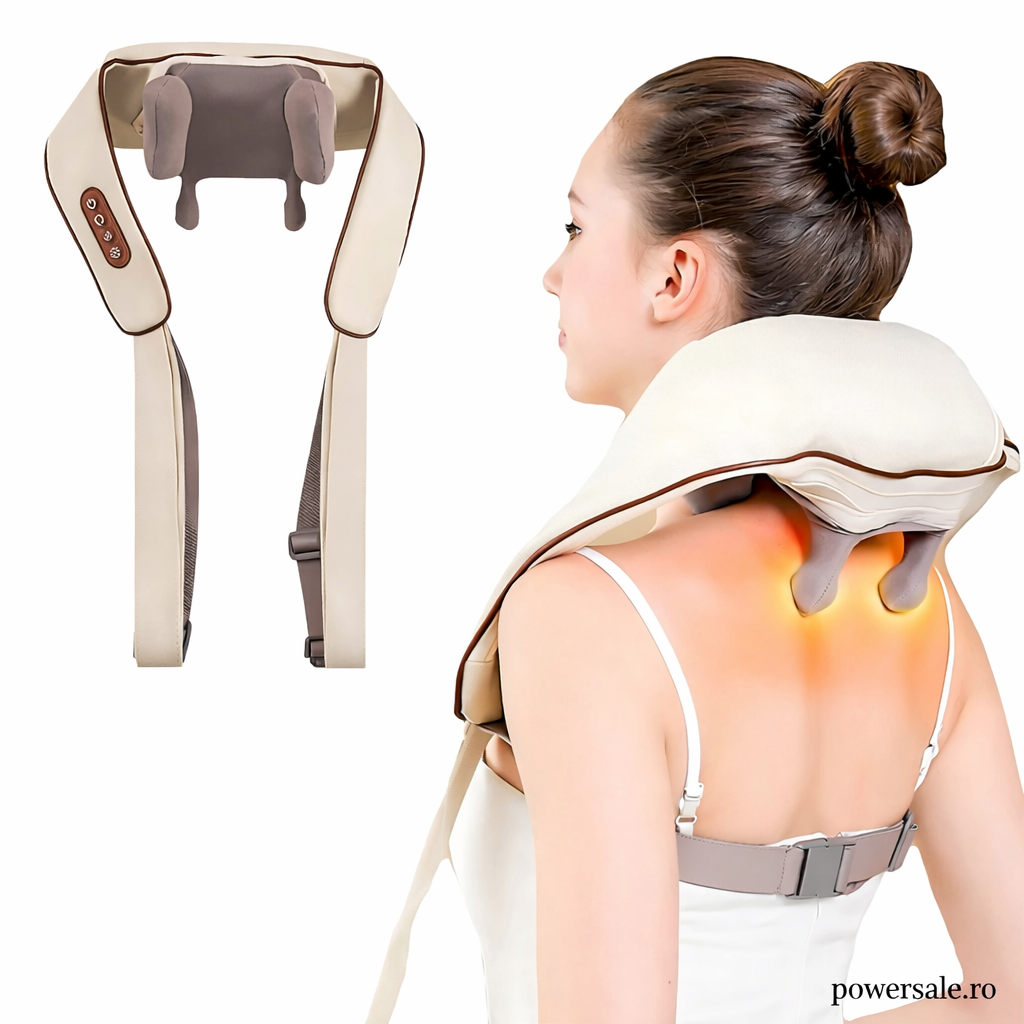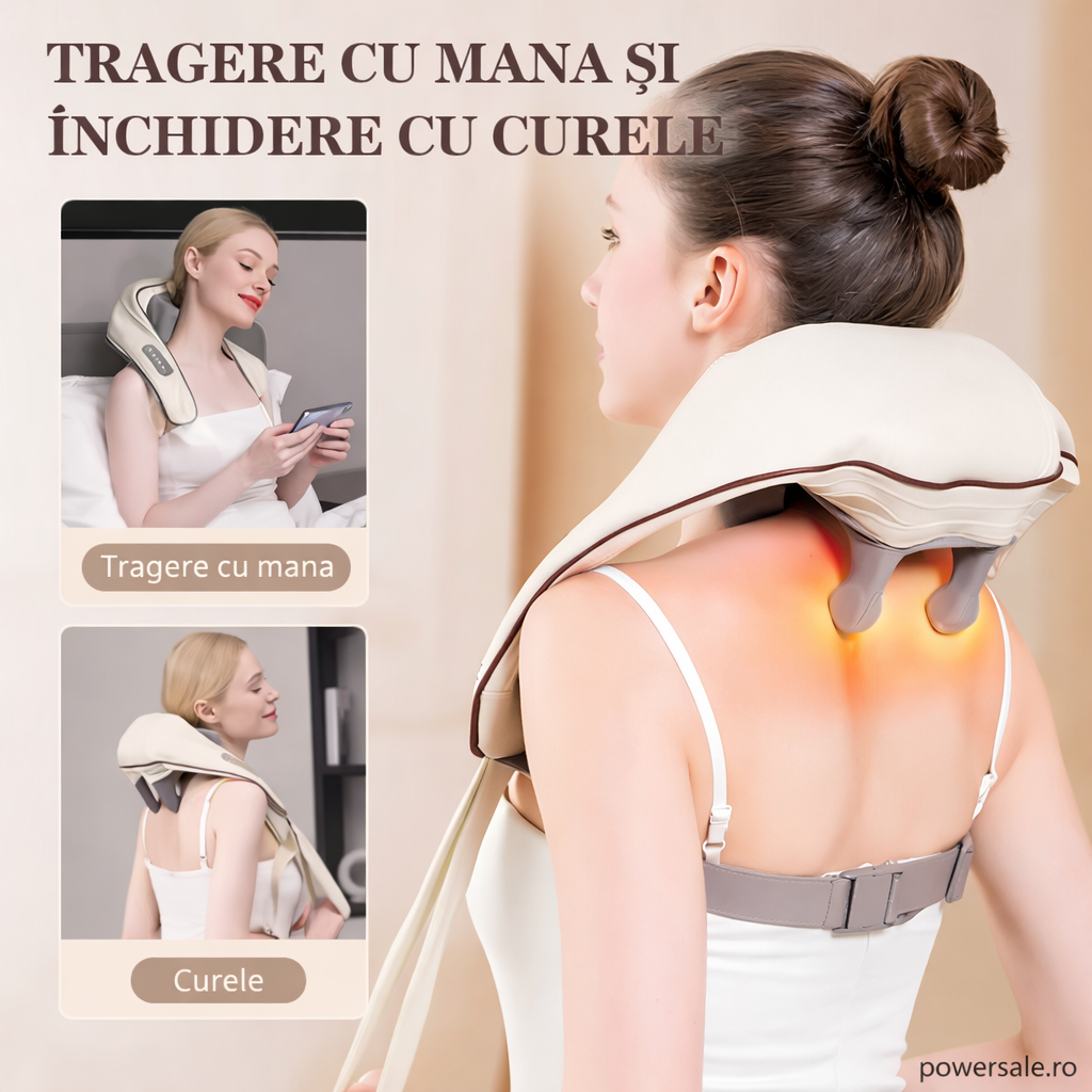 Aparatul electric de masaj pentru gât și corp este soluția ideală pentru eliminarea tensiunii musculare și a stresului acumulat zilnic. Datorită designului ergonomic în formă de pernă pentru umeri, oferă un masaj profund tip Shiatsu, imitând mișcările reale ale mâinilor.