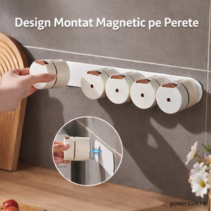 Sistemul permite montarea pe perete sau pe suprafețe metalice, economisind spațiu prețios pe blat și oferind un aspect modern și ordonat bucătăriei tale. Fiecare recipient este prevăzut cu mecanism de dozare precisă, astfel încât să poți controla cantitatea de sare sau condimente utilizată la fiecare preparat.