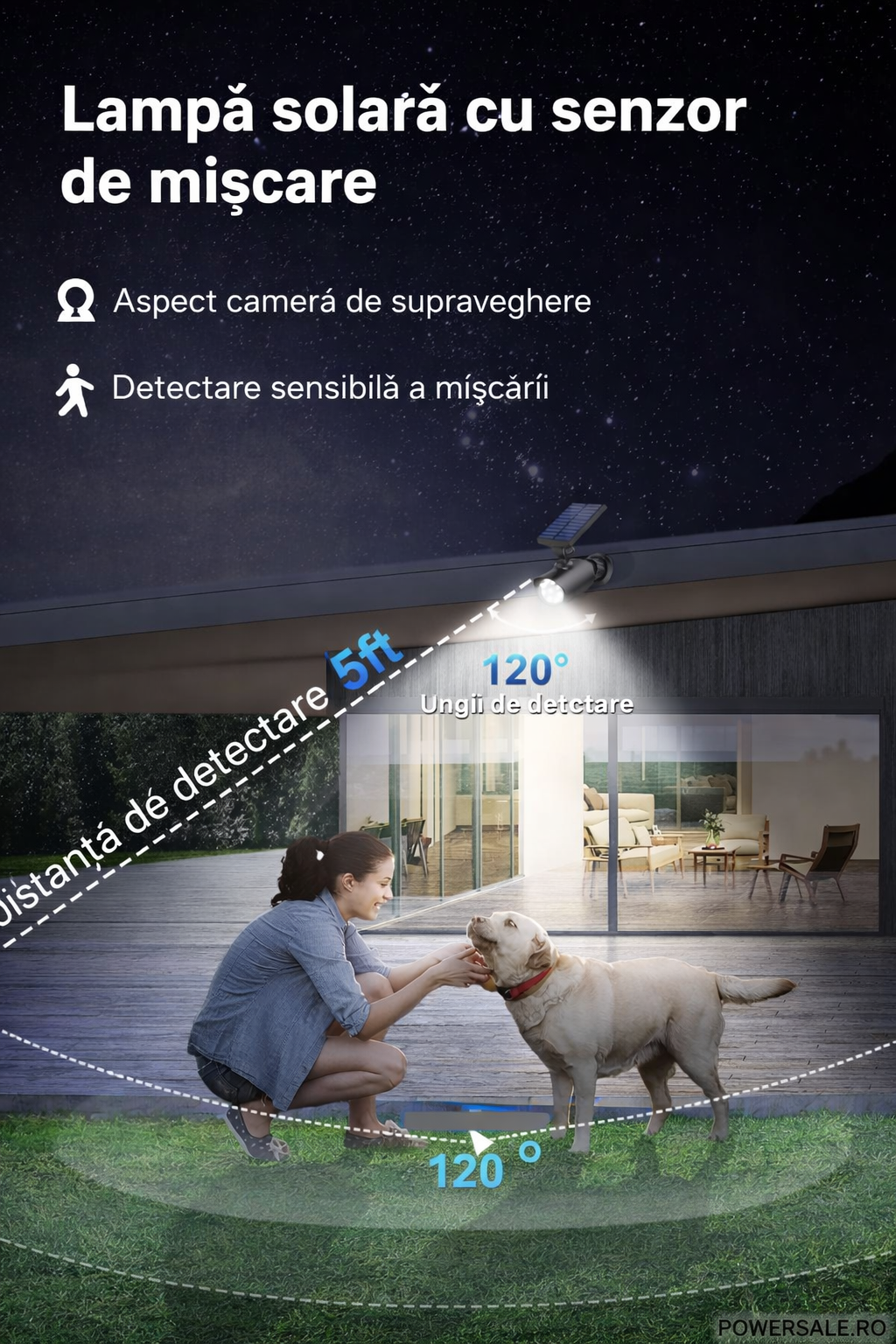 Unghi de detectare: ~120° (foarte potrivit pentru zone de trecere sau curți).